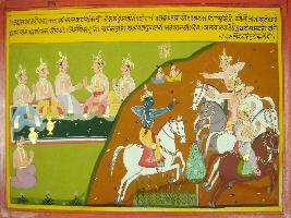 | Description / विवरण | Miniature painting based on Mahabharat - Udyam parva depicting Krishna telling Karna that in this month many cereals, medicine will accur and after the 7th day from today in the amabashya the fight will start. Krishna also blessed Karna to get his wishes fulfilled. |
