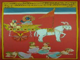 | Description / विवरण | Miniature painting based on Shri Bhagwat Gita. It depicts Krishna preaching Arjun that soul is pure which do not kill anybody and do not get killed. |