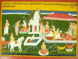 | Description / विवरण | Miniature painting based on Mahabharat - Gada parva depicting Balram is visiting Jajati tirth. Here king is shown performing yagna is giving daan to sage and reciting prayer. Balram is coming to this place, took bath and gave daan. |