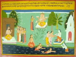 | Description / विवरण | Miniature painting based on Mahabharat - Gada parva depicting Vashishth rishi is meditating near bank of Sarswati river at middle lower part. Brahama is depicted at upper middle part with one women. At the right part, Vishvamitra is depicted sitting and talking to four women standing with folded hand. Baldev is depicted taking bath and giving daan. |
