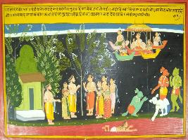 | Description / विवरण | Miniature painting based on Mahabharat - Gada parva depicting story of Saraswati river. Saraswati river took Vasista rishi to east direction. Vishwamitra gave curse to Saraswati that she would become unholy by demon. Demons are shown drinking water and making river dirty one day one rishi came to bank of Saraswati river. Mahadev came to bank of Saraswati river to meet sage and purified the river. |
