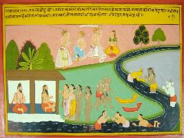 | Description / विवरण | Miniature painting based on Mahabharat - Gada parva depicting demon is going to sware rishi s ashram and asked him reason of becoming demon. They are seeing with folded hand at the lower right part, Rishi told them that they turned up demon because, they co,mitted sins by killing Brahman and women. They can purity themself after taking bath in Saraswati river. |