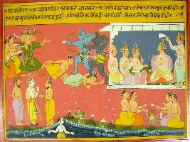 | Description / विवरण | Miniature painting based on Mahabharat - Gada parva depicting Balram after takingbath and giving daan went to Chandra tirtha. Another story is being depicted. There is war between god and demon after Chandra performed Raj surya yagna. Kartik was coronated as commnader-in-chief of god s army. |