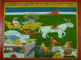 | Description / विवरण | Miniature painting based on Shri Bhagwat Gita. It depicts Krishna preaching Arjun to perform his dharma and says that the dharma of Kshatriya is to fight so Arjun should fight. |