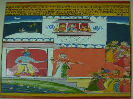 | Description / विवरण | Miniature painting based on Rasikpriya. Krishna is depicted with Radha with may women some on palace and some on ground. |