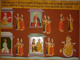 | Description / विवरण | Miniature painting based on Sanskrit drama - Prabodh Chandrodaya depicting two women standing with folded hands in front of a yogi at the upper right side. They are standing in front of a royal man, and talking each other. In the lower part, they are standing before a man and then a couple. Brahma is sitting at the lower left side. |
