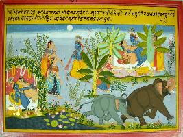 | Description / विवरण | Miniature painting based on Harivansha depicting Krishna in loving union with Radha in a bower under the moonlit night in the right and left corners. In the centre Krishna walking with two Gopis and a pair of elephants are shown. |