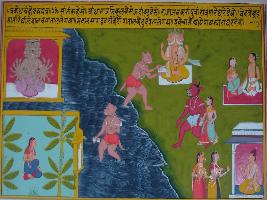 | Description / विवरण | Miniature painting based on Sanskrit drama - Prabodh Chandrodaya depicting Sita sitting in a garden as a prisoner. Ravan is seen on the upper part in a sea. In the other side, Brahma is sitting and a couple and a demon couple are also seen. |