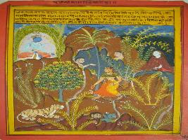 | Description / विवरण | Miniature painting based on Rasikpriya depicting Radha going to forest at night in a rainy day to meet Krishna, who is waiting for her in a bower, in spite of many demons and animals in her way. |