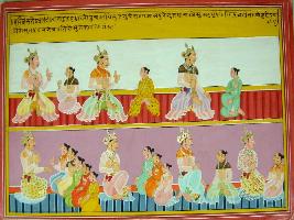 | Description / विवरण | Miniature painting based on Harivansha depicting Raja sitting with his son and giving there advise individually. On upper panel. At lower panel he is shown giving advise to all five son together. It is an incomplete painting. |