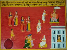 | Description / विवरण | Miniature painting based on Sanskrit drama - Prabodh Chandrodaya. Women are depicted talking and a boy near a circle, on the other side king is depicted talking to a female digamber and then she is talking to three people. |