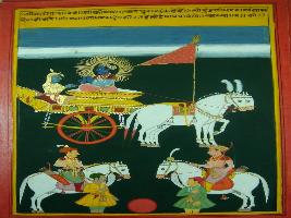 | Description / विवरण | Miniature painting based on Shri Bhagwat Gita. It depicts Krishna preaching Arjun if he will not perform Kshatriya dharma he will fall in sin. |