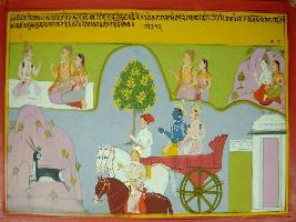 | Description / विवरण | Miniature painting based on Harivansha depicting Mahadev sitting with Parvati at the top left part. To their right, Kashayap Rishi and Aditi are going toward swarg lok. At the top right part, they are shown sitting and talking to Indra. At the lower position, Krishna is depicted with king Pradyuman on chariot and going toward Swarg lok. |