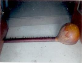 | Description / विवरण | Tumba, a part of a double round base support of a veena, in a pumpkin shape, hollow from inside, having two holes at the top and a big one at the bottom with flower petal shaped design painted all around them. Its upper layer and colours are flaking. |