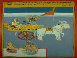 | Description / विवरण | Miniature painting based on Shri Bhagwat Gita. It depicts Krishna preaching the knowledge of Gita to Arjun and saying all warriors are scored and went leaving the battle field. |