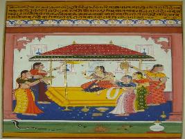 | Description / विवरण | Miniature painting based on Rasikpriya depicting Radha sitting on couch inside a palace and surrounded by female attendants, one is chori bearer, one carrying plate of pans, one carrying garland, one carrying a fan. But she is not enjoying anything due to the pain of separation with Krishna. |