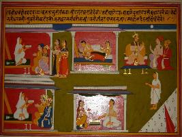 | Description / विवरण | Miniature painting based on Sanskrit drama - Prabodh Chandrodaya. On the upper part a monk is depicted with two men and two women, a couple is making love, a king is talking to two men. On the lower side a monk is depicted talking to two men, and a woman is depicted giving food to a monk and a monk is standing. |