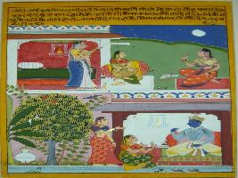| Description / विवरण | Miniature painting based on Rasikpriya depicting Krishna sitting on couch being told about the sad mood of Radha by her two friends. Above this, Radha, who is not enjoying even the beautiful nature around her, is shown sitting at the balcony with her friend and a female attendant. |