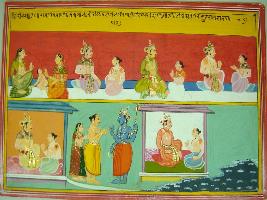 | Description / विवरण | Miniature painting based on Harivansha depicting the story of Ganga s arrival. A queen and five kings are sitting with their children in different panels. In the lower part Vishnu is standing with a man and a woman. |