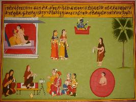 | Description / विवरण | Miniature painting based on Sanskrit drama - Prabodh Chandrodaya depicting Karuna mercy saying that one should learn to forgive everyone s sin, should not envy of any one s love. In the upper part, Vishnu in viman and mating of a couple are depicted. |