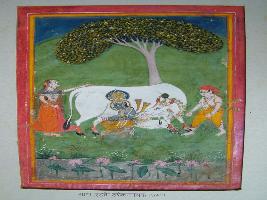 | Description / विवरण | It is a painting of Krishna who is milking cow. A calf is also shown. Radha is standing at the back of cow. |