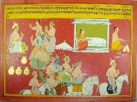 | Description / विवरण | Miniature painting based on Mahabharat - Udyam parva depicting Krishna telling to Karna that one day Pandavas will come to him and will touch his feet and take him with them. After that they will do yagna for him and on the 6th day Draupadi will come and marry him. He also says that Bhim and Arjun will hold the umbrella behind him and Yodhistir will proceed before him as an escort. |