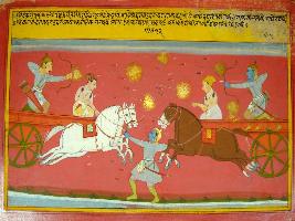 | Description / विवरण | Miniature painting based on Harivansha depicting war scene between Indra and Krishna. Indra is sitting on chariot and shooting flaming arrows towards Krishna, who is also pointing bow and arrows towards him. At the lower middle part, Pradyuman is standing on ground and shooting arrows towards Indra. |