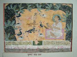 | Description / विवरण | It is a painting of child form of Krishna. Sudama is shown. Peacocks are shown surrounding Krishna. Three child form of Krishna walking by knee are shown. |