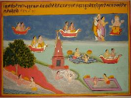 | Description / विवरण | Miniature painting based on Kashi khand depicting some bathing scenes. The painting says that by taking bath in the Migsar month at Haridwar and making donation anyone can get blessings of Brahma. |