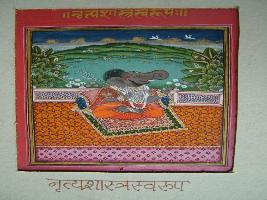 | Description / विवरण | It is a painting of Ganesha holding trident. He is shown in padmasan posture. Floral motives are shown at top. |