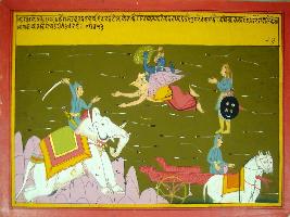| Description / विवरण | Miniature painting based on Harivansha depicting war between Indra and Krishna. Indra seated on Airavat and Krishna on Garuda. Garuda attacks on Airavat, and Airavat falls on a mountain named Parijaat. A man in namaskara mudra and an empty chariot are also seen in the left part. |