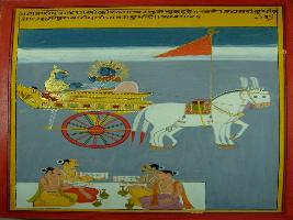 | Description / विवरण | Miniature painting based on Shri Bhagwat Gita. It depicts Krishna preaching Arjun that one who apply intelligence in hard work will get a tactful mind. |