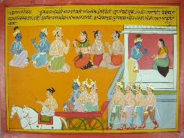 | Description / विवरण | Miniature painting based on Mahabharat - Udyam parva depicting at the upper left Kunti is talking to Krishna and Bhim is telling Arjun that whatever Draupadi says he should do this. After that Krishna gave many lessons to Arjun and returned. On the way he meet Kauravas and give lessons to them also and by taking Karna and Satyaki with him he moves forward. |