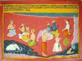 | Description / विवरण | Miniature painting based on Harivansha depicting Rishi Kashayap along with Aditi sitting with Indra, below them an elephant is shown in water. In the left part of the painting Krishna and Indra with Garuda are sitting with Shiv in Parijaat mountain. Ganga is shown in the left corner. |