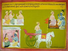 | Description / विवरण | Miniature painting based on Mahabharat - Udyam parva depicting Kunti is telling Krishna about her worriedness towards Nakul and Sahdeva. After that she tells Krishna that she is sad not because of the snatching away of the kingdom but because of the hard words Kauravas told to Draupadi in the court. |