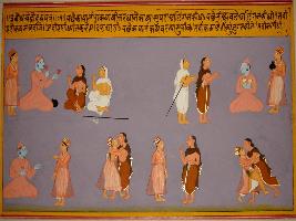 | Description / विवरण | Miniature painting based on Sanskrit drama - Prabodh Chandrodaya. Kapali and two monks decide to do penance, but instead they drink wine and a female and a monk make love. |