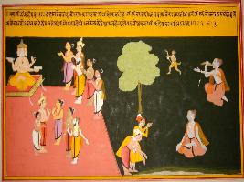| Description / विवरण | Miniature painting based on Kashi khand depicting Brahma and Devtas along with Indra. Brahma is telling them about the end of Batapi Rakshasa by Agastsya muni. |
