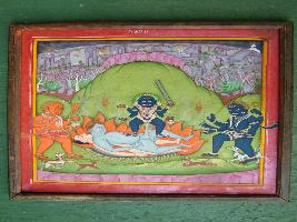 | Description / विवरण | It is a painting, depicting the Lord Shiva engaged in sex with the Kali the goddess of destruction and time . The four armed goddess shown holding the penis of Shiva. Shown laying on a lotus bed in bi perform, while Bhairavai black and red in l |