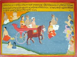 | Description / विवरण | Miniature painting based on Harivansha depicting Brahma talking with a sage in the upper right corner, are riding in a chariot in the middle part. In the left part Indra and other gods are seated with folded hands in front of Rishi Kashayap and his wife. In the right lower part Indra, Vayu and other gods are taking bath in the river. |