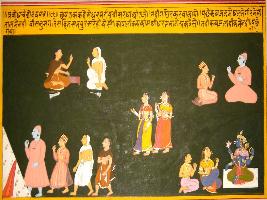 | Description / विवरण | Miniature painting based on Sanskrit drama - Prabodh Chandrodaya depicting Chayanak describing the coming of Shradha- the daughter of Dharam. In the upper right two monks are sitting. They are walking with Kapali and a female in the lower right part. In the left side Kapali and a woman are sitting and Vishnu is depicted talking to his devotees at Satapura. |