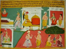 | Description / विवरण | Miniature painting based on Eklinga Mahatmya depicting a story of king Sur. king leaving his throne in order to do penance. On left, two monks are worshipping the image of Krishna under a sacred tree. A king is talking to a person in the middle below. In right below king shown with a Chauri bearer. |