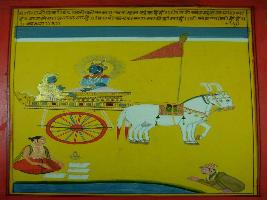 | Description / विवरण | Miniature painting based on Shri Bhagwat Gita. It depicts Krishna preaching Arjun about water who give us life and Krishna compared water with Veda. |