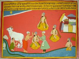 | Description / विवरण | Miniature painting based on Eklinga Mahatmya depicting Lomus rishi taking a holy dip in river, two men are shown serving him. Kamdhenu cow pouring her milk on Linga. |
