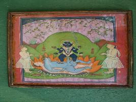 | Description / विवरण | It is a painting, depicting the bi form image of Shiva engaged in sex with Kali, the god of destruction and time. While four armed goddess is shown standing the Shiva, two priest is flanked by them in left right. |