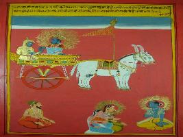 | Description / विवरण | Miniature painting based on Shri Bhagwat Gita. It depicts Krishna preaching Arjun to do yoga, karma don t leave these and to attain success ar perfection one has to do yoga. |
