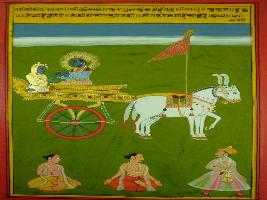 | Description / विवरण | Miniature painting based on Shri Bhagwat Gita. It depicts Krishna preaching Arjun, who is wise he also thinks about good as well as bad. |