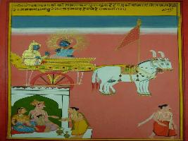 | Description / विवरण | Miniature painting based on Shri Bhagwat Gita. It depicts Krishna preaching Arjun about intelligence and wise man. Wise men get place early in Brahmlok. While in the lower part a couple is seen with their son donating wealth to a Brahman. |