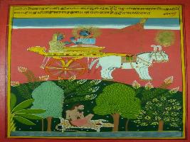 | Description / विवरण | Miniature painting based on Shri Bhagwat Gita. It depicts Krishna preaching Arjun about intelligence, yoga and result of work. |