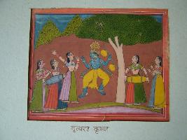 | Description / विवरण | It is a painting of Krishna dancing among Gopis. Five women are shown in dancing posture. Peacock crown is shown on head. |