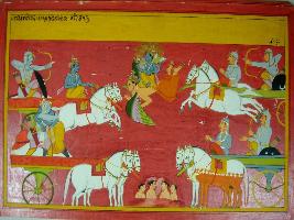 | Description / विवरण | Miniature painting based on Harivansha depicting war between Arjun and a king in the upper part. Krishna is driving the chariot of Arjun in the right side. The king is also on a chariot in the opposite side. In between them, Vishnu is seen on Garuda. In the lower part, the war has stopped and Krishna and Arjun are embracing each other and the king is sitting and watching. In between them, the upper portion of four men are seen. |